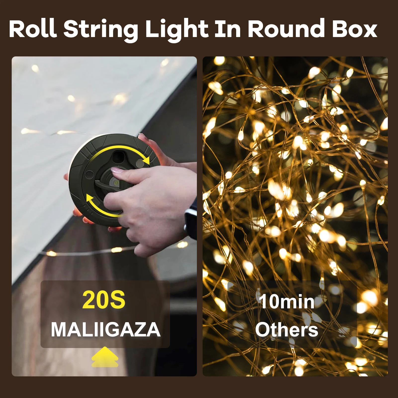 Unlike traditional tangled string lights, this 10-meter LED string light features a built-in hidden reel.