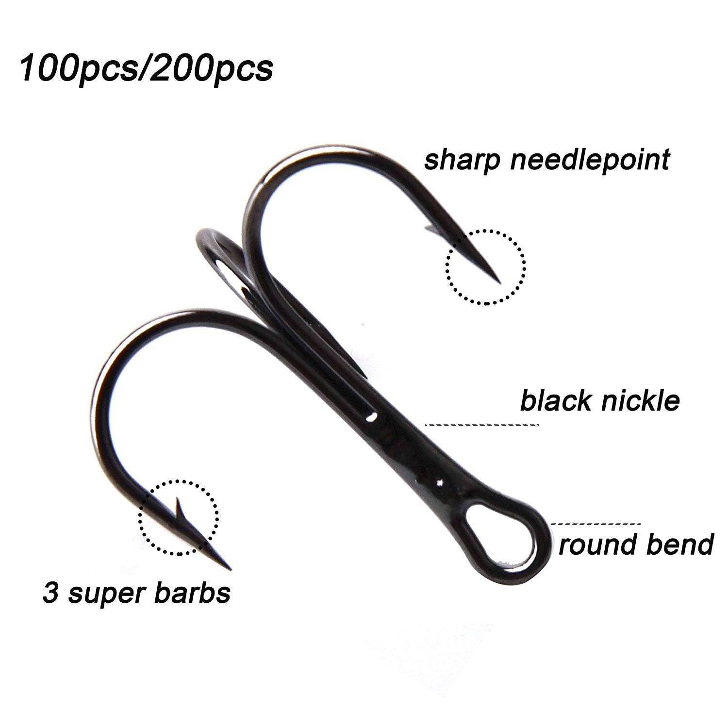 UNIQUE DESIGN- Treble fishing hooks have barb hooks, extremely sharp, elosed eye, small wide gap.