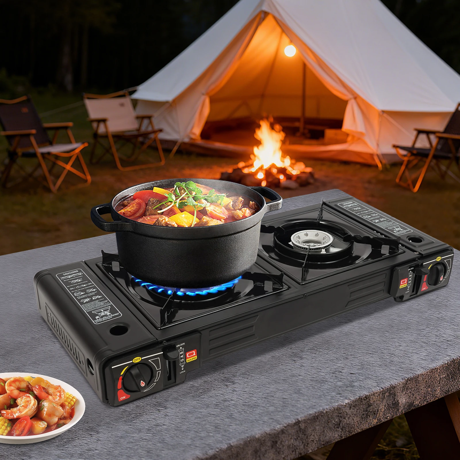 Portable 2-Burner Camping Stove 2x2500W Gas Powered with Anti-Stick Baking Tray Overpressure Protection Carrying Case for Outdoor Picnic RV