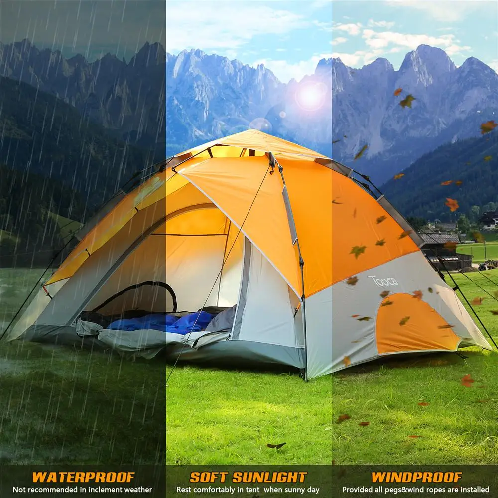 ①WATERPROOF: Outer tent 190T/inner tent 190T/base fabric 210T,waterproof strips been added to sewing traces of tent, So when you're in light, moderate rain can provide you a dry interior.
