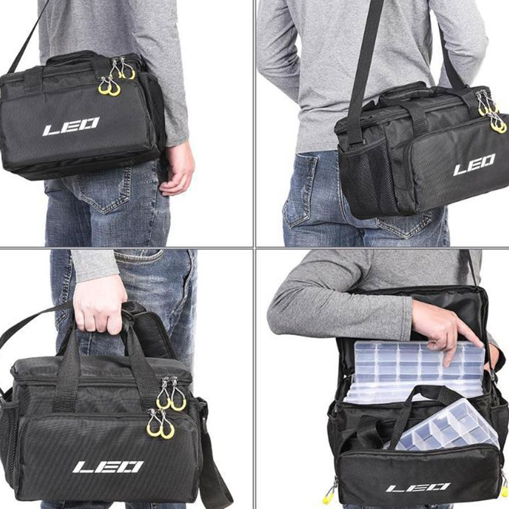 Made of 1680D canvas, this fishing tackle storage bag is very durable, wear-resistant and long lasting.Fishing bag has a main compartment, a small pocket and two side mesh bags, can store a lot of fishing accessories.A shoulder strap with adjustable buckle fit for different people.