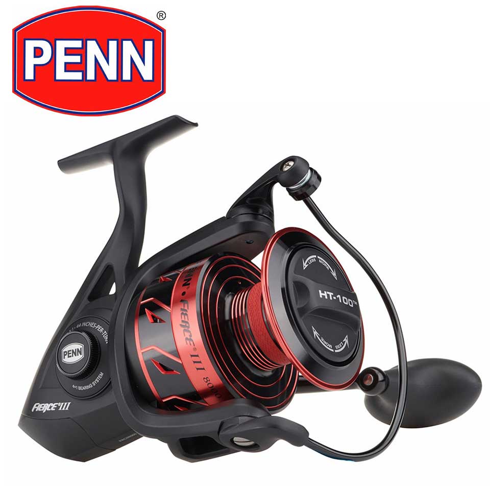 The PENN® Fierce® III spinning reels are available in a range of sizes, from 1000 to 8000. Featuring a full metal body and sideplate, along with PENN HT-100™ carbon fiber drag washers, the Fierce III can handle anything inshore or nearshore. A 4+1 shielded stainless steel ball bearing system ensures smooth retrieves while the heavy-duty aluminum bail wire and superline spool allow for easy line management.