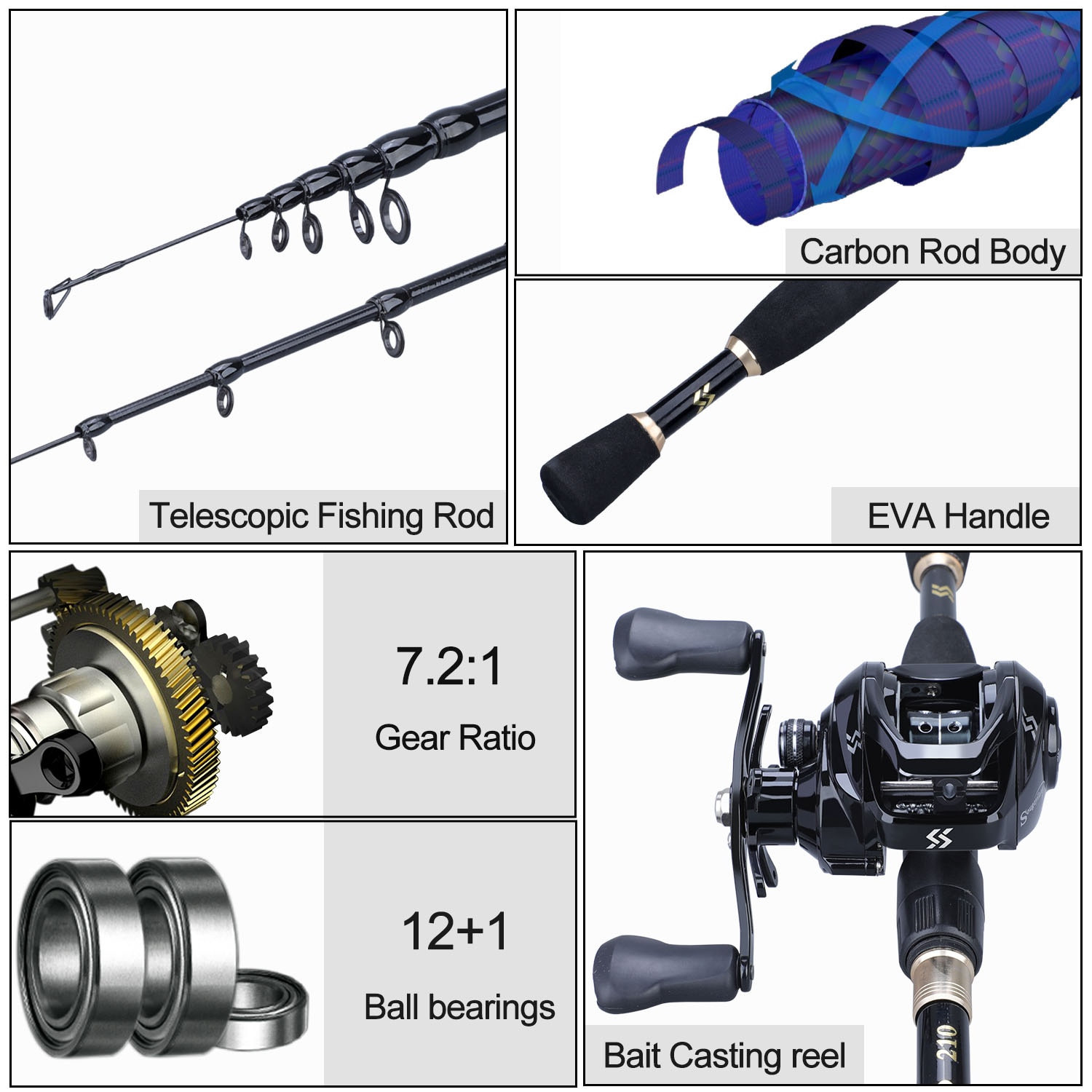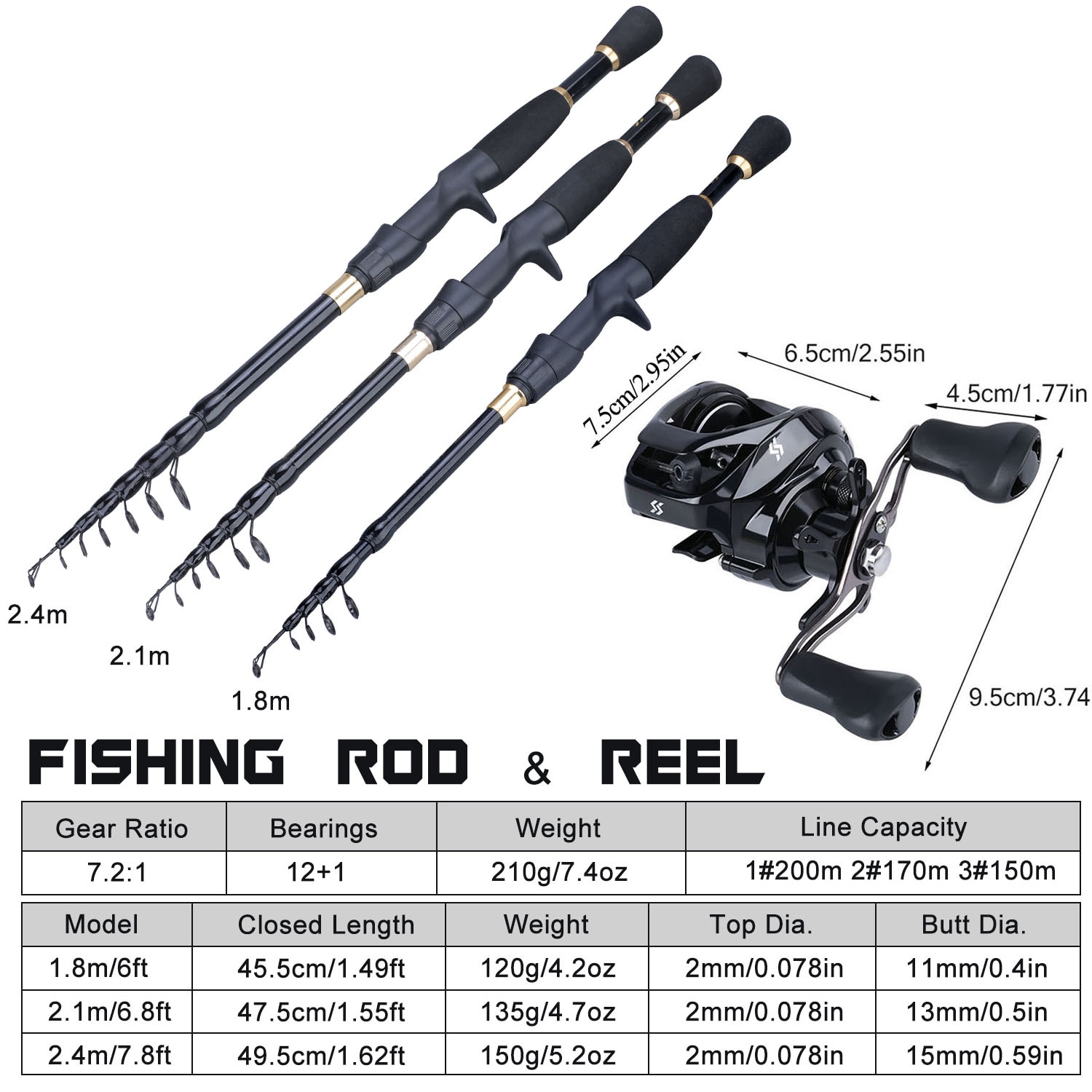 Sougayilang 1.8-2.4m Telescopic Casting Fishing Combo Portable Ultralight Rod and 12+1BB 7.2:1 High Speed Gear Ratio Fishing Reel
